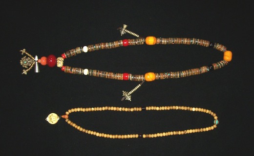以下繼續再為大家介紹人骨念珠,每串人骨念珠的來歷都有著他的故事,在西藏古今都有天葬的風俗,喇嘛們在死後會把自己的身體供給鳥獸蟲蟻食用。而喇嘛在天葬之後把禿鷹吃剩的遺骨也給佈施奉獻出來,作為法器用。那人骨念珠就是喇嘛的遺骨所做成的,通常只有兩個部分的骨頭可以做念珠,一是手指骨,一是眉輪骨(就是眉心中間的骨頭)。為什麼只取用這兩處的骨頭呢?因為這兩個地方的骨頭,和修行是最有關係,眉心骨是念力觀想的門,也是置心的所在,真佛修行者一生的成就盡在于斯。手指骨則是平常用來行法、數念珠、做法事的,也是修行的關鍵。說起來,眉心骨與手指骨可說是一個修行者最常用的地方了。