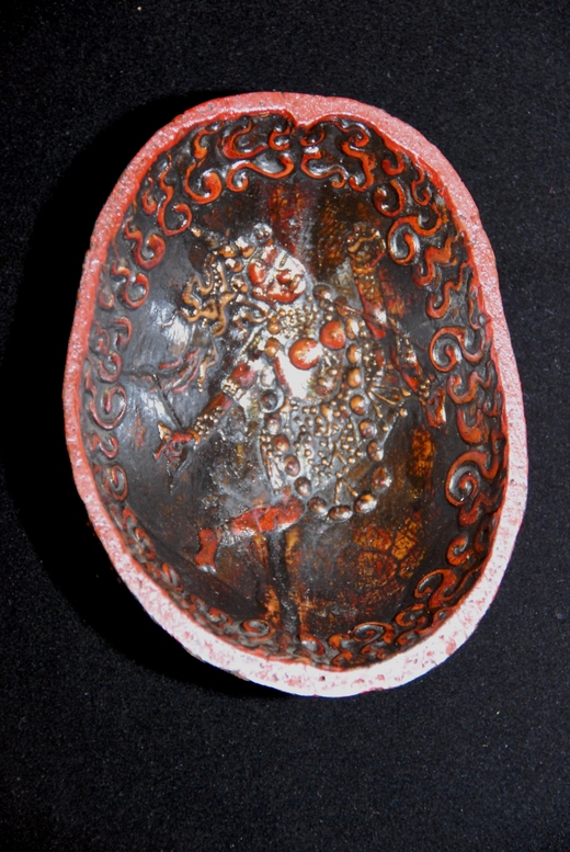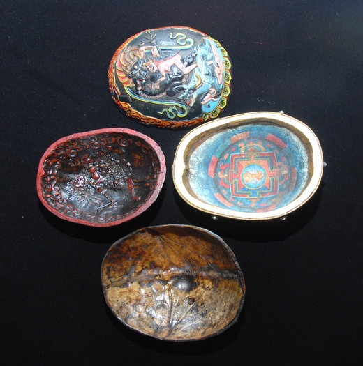 在製作嘎巴拉碗的頭蓋骨本身,最好必須是修行很有成就的喇嘛骨,如修持大手印無上密成就者。而人骨法器基本上的區分,在此略為大家介紹,其它骨器會再以專文介紹。(一),喇嘛骨念珠,通常是行者在進入密教金剛部修法階段時所使用的法器之一,但先決條件是行者必須要先具足基礎密法修持之後,再由上師親自傳授指導修習。(二),嘎巴拉顱器供具,即頭蓋骨!由眼框以上切平至頭頂部份所製成,邊緣包上鑲金或銀邊並綴飾各種寶石,其上有寶蓋,其下有座呈三角形並刻有代表火焰的花紋圖案。(三),嘎巴拉亦有整顆供具,此為供具之上供,如是大成就者之靈骨舍利又更好,此為最上供,能令本尊、空行歡喜。(四),喇嘛骨手鼓又稱嘎巴拉鼓,是由兩個顱骨所製成雙面,並覆蓋以人皮、蛇皮、或牛羊皮等材質當鼓面,鼓身腰部繫上彩帶,可將鼓捲成桶狀放於鼓袋便利收藏,並在鼓腰繫兩小鎚,手搖鼓身鎚擊鼓面而發聲。而行者修法時搖鼓,代表讚頌祈請,諸佛、菩薩、金剛、諸天之降臨加持功德,同時也配合金剛鈴杵來使用。(五),腿骨喇叭,藏語(剛鈴),是採用小腿骨所製成,兩端包上鑲金及銀飾邊並綴鑲寶石,行者通常是用於中陰超度及施身法之法會,所吹奏出的哀鳴樂音能招請一切對象。