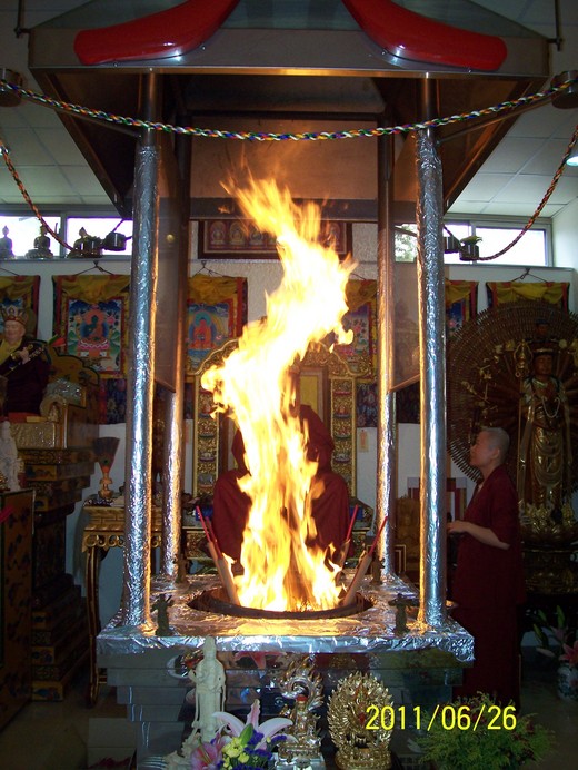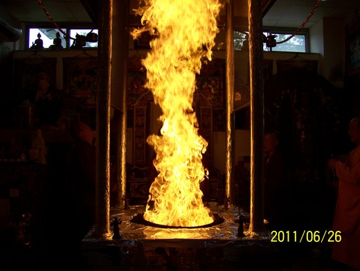 那今日法會護摩火供主尊是不動明王,亦稱不動使者或不動尊、無動尊,衪是大日如來的教令輪身,不動明王名稱中的「不動」,是指衪本身的願力不變,如岩石般的堅固,沒有任何東西可以改變撼動衪;「明」則乃象徵智慧的光芒、是如來的智慧光明遍照;「王」是指在諸明王之中不動明王也是最高位尊者,為一切明王主尊之首,也就是沒有比祂更高的明王了,祂的位階是最高的,有點像倚天屠龍記裡面的倚天劍和屠龍刀一樣,這倚天一出所有的人都必須聽祂號召,這威力是很大的。不動明王其誓願為:「見我身者發菩提心,聞我名者斷惡修善,聽我法者得大智慧,知我心者即身成佛。」不動明王本身為大日如來的忿怒化身,在日本佛教裡,尤其是東密的信徒,大多數是信奉不動明王,不動明王周身呈現青藍色,坐於磐石法座上!右手持智慧劍,左手拿五彩金剛索,右眼仰視,左眼俯視,周身火焰強烈,有兩隻火龍在祂周身旋轉。不動明王以憤怒的形象示人,最主要是表示祂能夠除障降妖、驅魔斬鬼。不動明王像有二臂、四臂、六臂的形象,但大多是以兩臂形象在做觀想。 而不動明王本身亦有諸多化身,其法門可說是非常的多,有綠、黑、紅、黄、白五色五方不動明王結界護身法,這每一尊都有其特別的法門,如不動明王瀑布修行法,不動明王也有念力點火法等等。我記得不動明王法我在師尊的地方得了很多的灌頂,像瀑布修行法、五色五方不動明王結界護身法,以上的法如這個在未來有機緣,我會代師口傳會來為大家講授,祂的法非常的珍貴,尤其是不動明王念力點火法,這個法不容易修!但在喜馬拉雅山專修九字真言法成就的尊者,他們就具足了這方面的能力