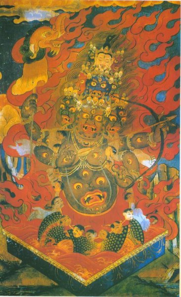 此尊有九首,頂有老鴉首。九首皆載五骷髏冠,披人皮,下著虎皮裙,項掛鮮血人首,以蛇飾骨飾為身莊嚴。四臂主二手持弓箭作射狀,右次手執摩羯海怪幢,左次手執蛇繩,全身皆眼,身以下乃龍形,作蜿蜒狀。此次法會亦經聖尊蓮生法王親自加持,歡迎十方真佛弟子同門善信大德一同護持法會,同沾法喜!