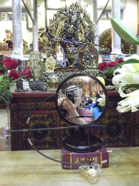 那麼你就是觀想喇呼拉從鏡子裡面出現,你比祂的手印,那麼持喇呼拉的咒語,嗡。喇呼拉耶。吽呸。那麼護法的咒,你在持的過程裡面,你不能冷冷的,軟軟的,輕輕的,既然是護法,祂的咒語,祂的力量就要出現,短捷鏗鏘有力,那麼準備一支弓箭,你現在看到那些弓箭,都是蓮杏法師用心做的,事實上,這些法器只有兩種人可以動手做而已,一個就是處子,男女童子,一個就是法師,他做的法器那個是有加持力的,那麼這個弓箭有什麼用途呢?你今天修法,你用這個弓箭來作觀想,來作加持,來作供養,所以剛剛在法會的時候,作完加持後我也有下供,這個護法的弓箭就是這樣,你把這個弓箭掛在進出口的地方,或是客廳進來看的到的地方,或是密壇,這個都有鎮煞的作用啊,因為是喇呼拉,既然是鬼王嘛,平時那些都是祂的小嘍嘍,這個就好像護身一樣啊,好不好用,很好用!而法會加持的除障破煞的黑芝麻米鹽,那一小包的米鹽也是很好用的,譬如說家裡有病人,或是你住的地方,你的房間,或是你去的地方,例如去到喪葬的地方,你帶一包在身上,你灑一點在水裡面淨身,可以除障,你灑一點在你房間的四週,它也有破煞的作用,好不好用,當然很好用!你們可以跟法師請購,隨意贊助道場供品!因為一場法會也要不少供品,我們都燒水沉香,也不用其他的香,我看全世界只有我這樣,十斤十斤,一箱一箱,下供在燒水沉香,我家有錢嘛(上師笑眾人笑)!所以修護法就是這樣,要捨得,所以今天這一場法會,師尊也親自加持了,那又是我們首次這樣祈請,召請喇呼拉,我想目前沒有人做這尊法會啦,除了根本上師傳了一次法以外,目前沒有人做,我今天只是稍講解一下祂的法,因為祂的法很珍貴,所以一般的法王,他不太講,因為祂是主降伏法嘛,祂都是告訴你一些方法,你要是看某些人不順眼,你降伏法一收,哇那個人剉賽了(台語拉屎),嚴重了,代誌大條了,因為祂的力量很大,所以祂能夠殺無赦!很快的降伏對方。