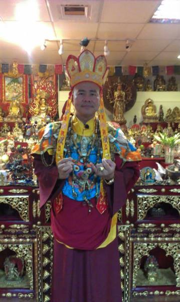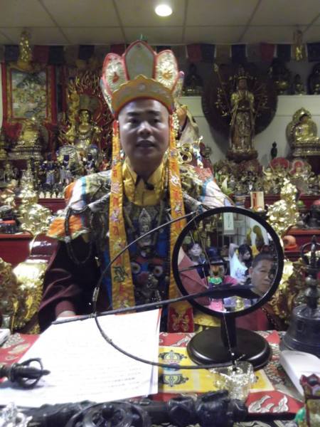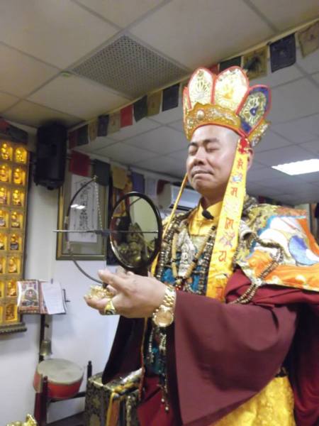 所以你們要知道,你供養祂修祂的法,祂會來幫助你的,而且是感應非常的快速,護法的感應比什麼還快,所以為什麼叫護法,急急如律令,所以很多人說這個護法長這麼兇惡,怎麼會兇惡,你如果了解祂的背景,你愛祂都來不及了,他是一個非常可愛的尊者,偉大的尊者,只是被陷害了,後來金剛手菩薩感化了祂,所以你們今天要修喇呼拉尊者,首先雙手結期剋印,再觀想這面鏡子有喇呼拉的咒語種子字,在鏡子裡面放光,那麼整個鏡面都是火光,那麼喇呼拉尊者由裡面出現,你要觀想這個三角座變得很大,然後喇呼拉尊者拿著箭,祂在這個三角座裡面,龍身,那個海浪巨濤,非常洶湧,火的聲音很大,祂的動作驚天闢地啊,像颱風天有沒有,說到颱風天,我又想到了,每次我在首傳護法,尤其是我第一次做的時候,一定是颱風,上次大威德金剛也是颱風,我只能說今天你們大家來啊,非常有福報,因為這個法不能常傳啊,你們今天來是真正受到加持,很大很大的加持,這場法會師尊也特別加持過了,我這一次從美國回來,我有特地跟師尊報告這場法會,那師尊也有修法特別的加持,我說我要傳這個法講解法義,因為每次時間都不夠啊,師尊怎麼講?八萬四千法門啊,當然我知道我跑前面一定會中槍,但是我也不管,其實我是在修行的人,本來就是要為眾生請法。