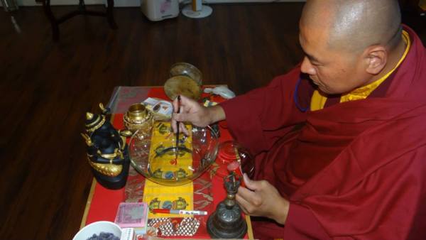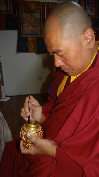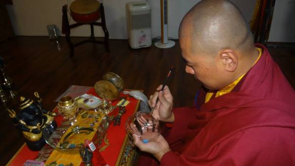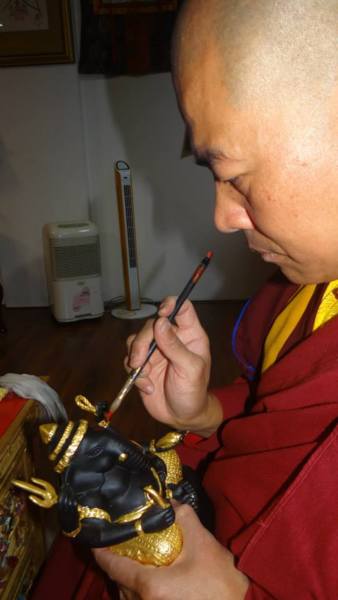 開始製作前必須要念清淨咒,保持身口意一切清淨,所有的裝藏物件一律過香清淨,一智同修會所裝藏的寶瓶內容物,都是樂智上師做大供養,祈請根本傳承上師親自加持,希望給予供者最大的利益。再來須在寶瓶上書寫財神種子字,也在要供奉的主尊金身上畫第三眼點精,一樣書寫種子字,一切裝藏的過程必須要如法如儀軌,它才會有作用!而且都要經過法會的加持,就如同一開始佈壇前做了一場三象王財神的法會,取其護摩灰,這代表大供養本尊歡喜加持!那麼還要有五姓財神的總持甘露丸,五姓財神的總持祈禱文,以及祂的咒語,象徵一切財神的總持。這裡面也要放真佛經,表示傳承加持力不斷,也放置大方廣佛華嚴經,祈請十方三世一切佛的總持加持。亦須放置藏紅花裝藏!