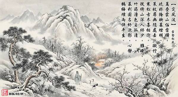 網上看完一段風景影片,有感而寫下這闋詞。 雪後雲山,林幽燈暗,寒松古木相迎,引人入勝;徙倚放懷,見竹筠色澹,影自孤清,雅意悠然。悟慕利圖名終為泡影,意靜懷平,任鶴梅煙雨伴平生,心融萬籟,樂趣其中。