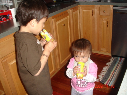 老媽子跟老公說,以前家裏只有Hayden一個小孩時,他到了三歲都還不知道什麼是巧克力?什麼是冰淇淋?更不用說什麼是巧克力牛奶了.....怎知小的現在都還沒一歲半,在哥哥的耳濡目染下,哪些東西是甜點她都知道,一看到甜的動作比蒼蠅還快.....有個模仿學習的對象,真的是有差喔!