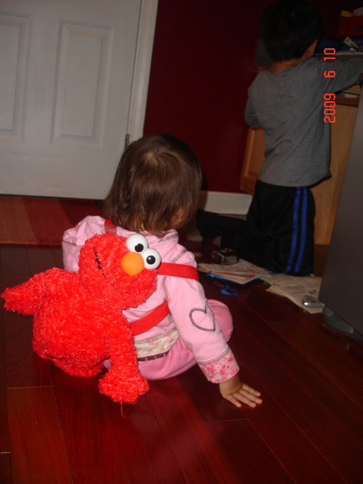 那Elmo背包很重嗎? Hana好像覺得那有一點重到讓她無法站起來!.