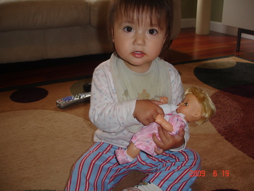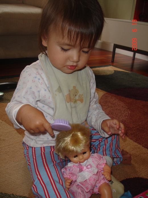每天早上,Hana一定會記得餵她的baby喝牛奶,喝完奶後還會幫她梳頭髮,一副溫柔的小媽媽樣子,不過偶爾她也會不管三七二十一,隨便把baby丟在地上.....