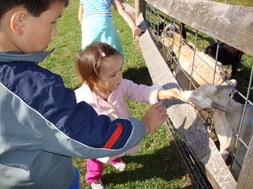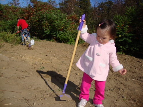 想到去年來這裏,Hana可是全身上下包得暖暖的坐在娃娃車裏看我們挖蕃薯,今天她連車也沒帶,就在果園和蕃薯園裏東奔西跑,連抱都不給抱,非要自己走不可,不但蕃薯堅持要自己挖,連去年嚇到哭死都不敢靠近的農場動物,今天可是餵到流連忘返走都不想走....小孩子變得真快啊!