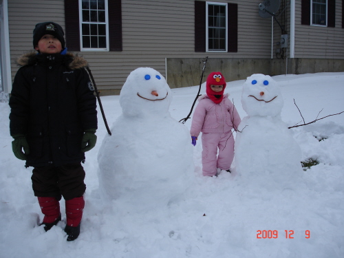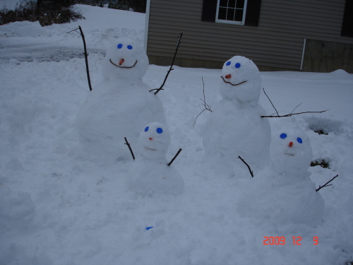 所以,第一個大雪人就這麼造出來了!前後不用十分鐘,做出興趣的老媽子,繼續又堆了另一個雪人...然後第三個、第四個.....完成了兩大一小的雪人家庭!