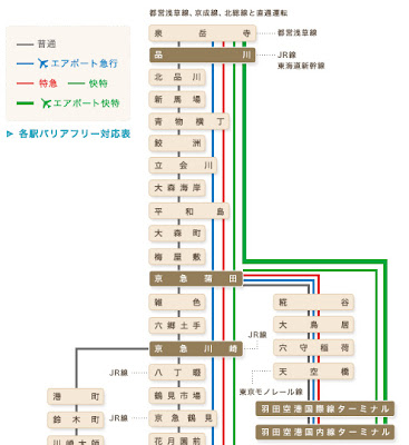 抵達日本後,轉搭京急電鐵KEIKYU綠色線的快車30分鐘內就可以到東京市區品川站,而且只要日幣400塊。小心不要坐到灰色線的普通車,因為它每站都停,票價同樣400日幣。