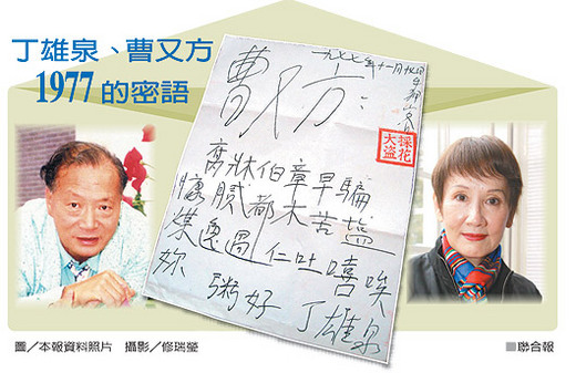 知名華裔畫家丁雄泉本月十七日病逝美國,他生前和去年病故的知名女作家曹又方往來書信首度曝光!畫壇「採花大盜」VS.文壇「維納斯」,兩位都有浪漫性格,展現在書信裡的,盡是兩人才懂的密語,流露濃濃的神秘文氣,又留給世人無限遐想!