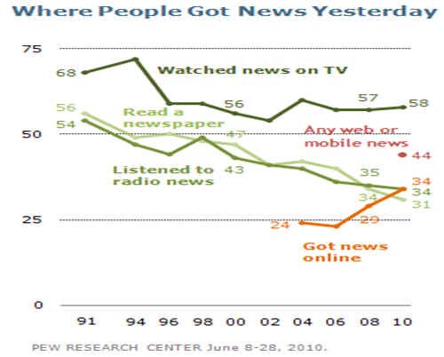 過去十年,美國人花費更多的時間閱覽新聞,數位化平台發揮很大的作用,似乎彌補了溫和下跌的傳統平台。大約三分之一(34%)的人表示,他們在線上瀏覽昨天的新聞,透過行動電話、電子郵件、社群網絡和播客等方式,取得新聞的人也都增加了,44 % 的人透過一個或多個數位載具得到新聞內容。
