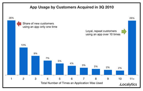 根據 Localytics 調查,消費者快速下載應用程式,同樣也會快速地刪除它,企業運用App行銷,不僅僅是希望消費者下載,更希望消費者長期使用它。Localytics 上個月的調查結果,有 26 %的人僅使用應用程式一次就拋棄;本週公佈的新數據,客戶中每月使用超過 10 次的人,佔了 26 %。
