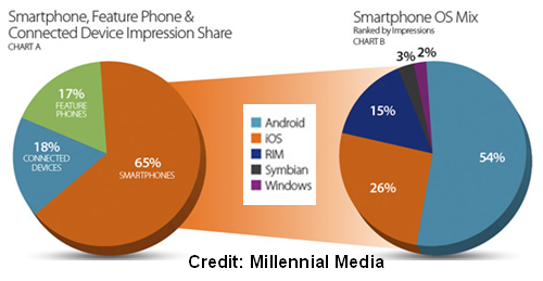 根據 Millenial 媒體六月行動載具報告發現,Android 以 54 % 的行動廣告市佔率拿下冠軍,蘋果的 iOS 以 26 % 排名第二位,其餘依序為,RIM 的黑莓機 15 %,諾基亞的 Symbian 3 %及微軟的 Windows Mobile 的 2 %。行動設備上的廣告量,Windows 7 手機季增率為 31%,蘋果系列(包括 iPhone、iPad 及 iPod Touch )季增率為 18 %。