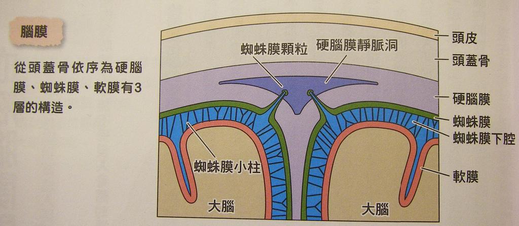 人的腦是極為柔軟的組織,被頭蓋骨硬骨頭保護,接著是三層的「腦膜」包覆,跟頭蓋骨連接的是硬腦膜、內側蜘蛛膜,最裡面跟腦直接接觸的是滲入腦皮質溝中的軟膜。蜘蛛膜跟軟膜之間有蜘蛛膜下腔的洞孔,填滿120~170ml腦脊髓液的特殊液體,因此腦受到衝擊時,有如軟墊有緩衝的功能。硬腦膜又分為兩層:骨膜層及腦膜層,通常是融合覆蓋大部份的腦,但某區域是分開圍繞硬腦膜竇(如圖硬腦膜靜脈洞,亦為起訴書所稱之硬腦膜下腔),硬腦膜竇靜脈微血管收集靜脈血,回流到頸部的頸內靜脈。腦脊髓液最終於顱頂穿過靜脈微血管的蛛網膜絨毛管壁,流入靜脈系統血流。