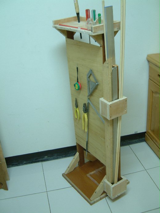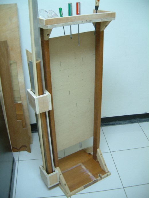 至於,原設計圖中有設計加上輪子,增加靈活度,但今天在施作時,突然想到加了輪子,萬一被我們家那小子(就是我兒子阿孚,今年五歲!),爬了上去,重心不穩給倒了下來.那可就糟了!!所以,就決定暫時不裝上去好了(反正工作室就這麼大,拿工具走個1,2步就到了啦!!)