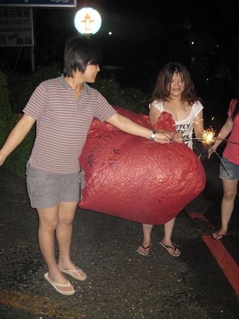 終於點著了,玩完了仙女棒,重頭戲來囉~要開始放天燈了喔~