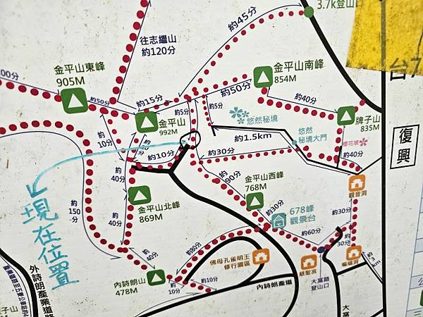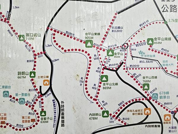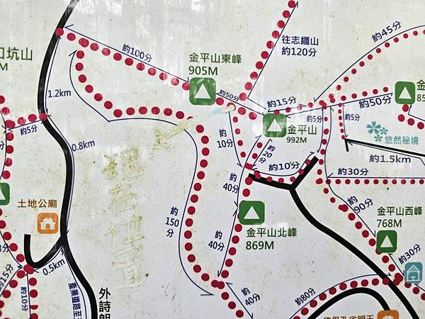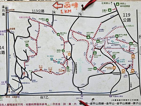 原本想金平山全紀錄,但山勢陡峭,爬到金平山時,海拔高度已經爬升快1000米,累了,開始思考東峰及北峰要選哪座,最後選擇東峰,然後從悠然秘境下山,走觀音洞南口回到蝙蝠洞停車場,計里程12.4公里,海拔爬升1050米,詳如下圖。航跡下載。