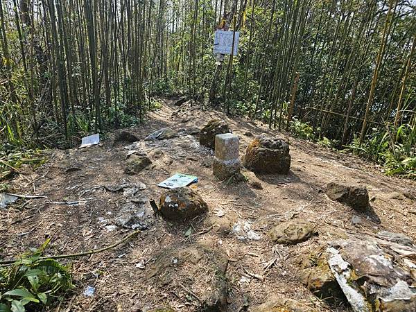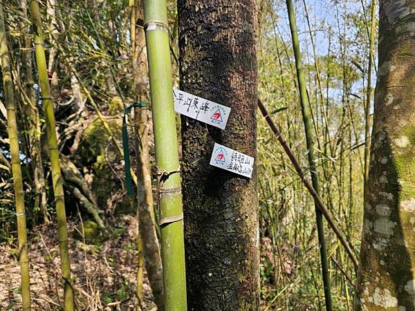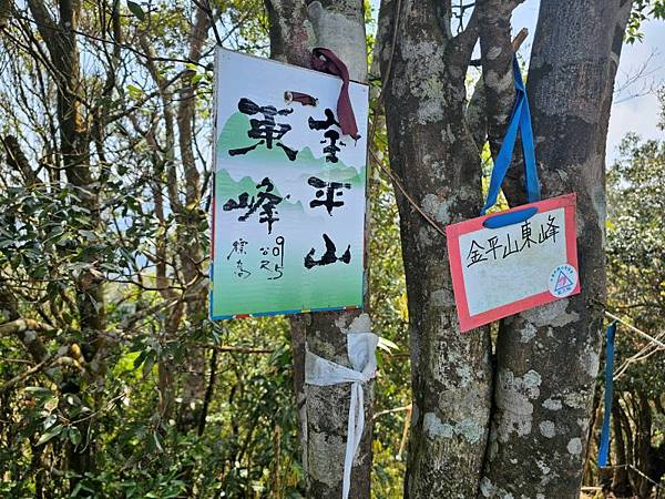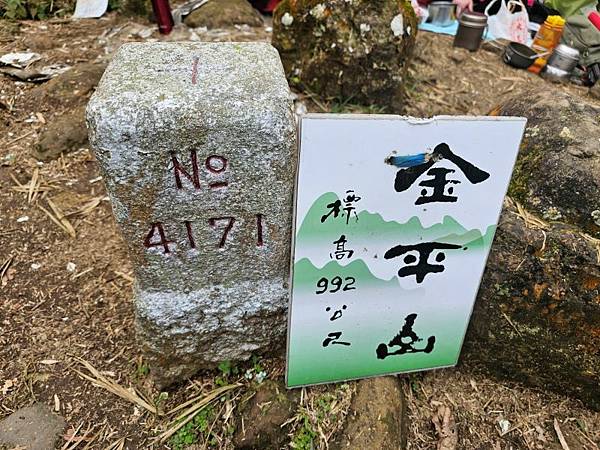 ↑12:14金平山,三等三角點,編號4171,高992公尺,第二次登臨。山頂有2路,左下北峰,前行東峰,取前行。