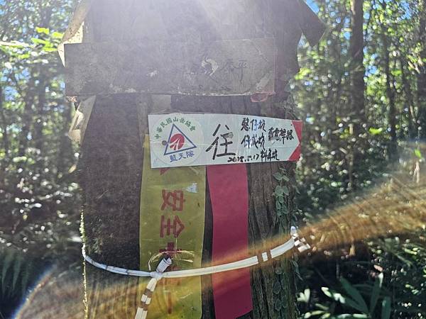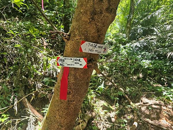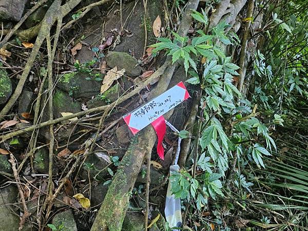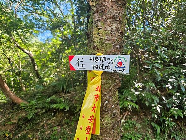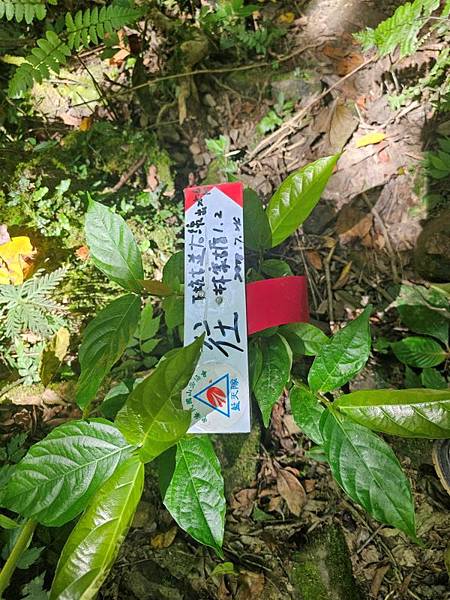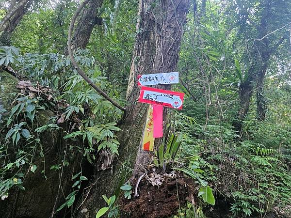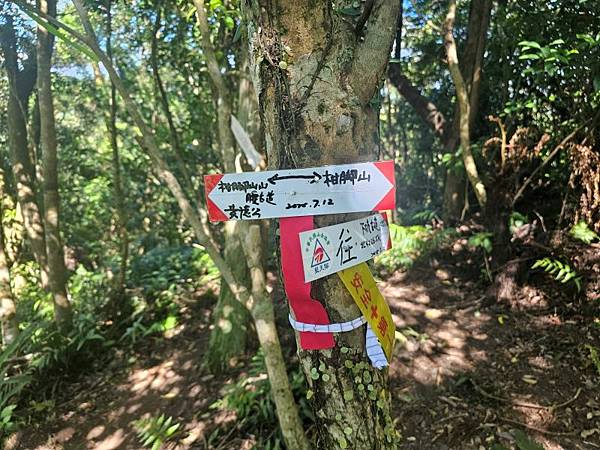 ↑08:18叉路,右下通下坑古道右線,左上標示游家古道,往柑腳山。前方有2位,藍天隊的成員,聊天中得知其中一位參與開路,感謝。