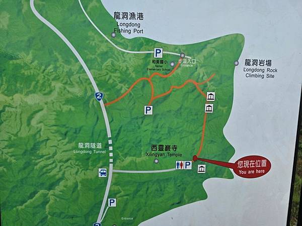龍洞灣岬步道有3個出入口,一處在西靈巖寺,一處在和美國小,一處在步道中間設有停車場,今日從西靈巖寺進入,先到觀景台,然後下到龍洞灣岬,再走步道到和美國小,原路去回,計里程3.6公里,如下圖。
