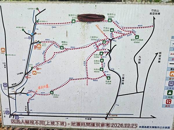 今日停車於保安宮叉路口前,往回走,先登大厝坑山,依序鳥尾崙、鳥背尖、鳥嘴尖、鳥頭尖、三層坪山、麒麟山,出保安宮,計里程9.2公里,如下圖。