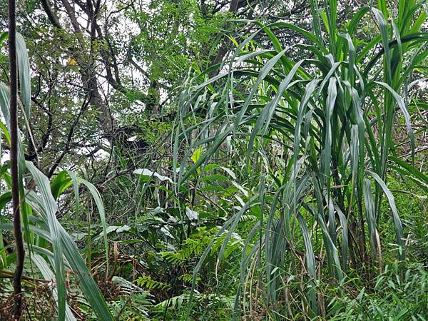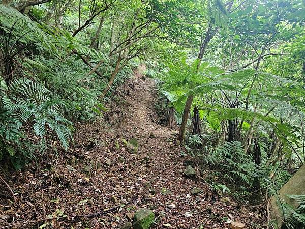 ↑09:53走在山腰路,有邊坡,望向普賢寺上方的來時路。