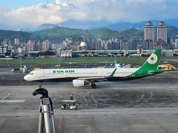 ↑這是有冷氣的觀景台,最前面擠滿人。一架國內班機起飛,是立榮航空小飛機。大飛機滑行中準備起飛。