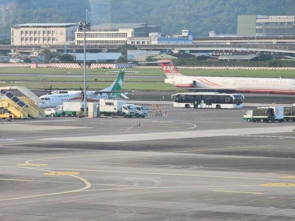 ↑國內航班,旅客搭接駁車登機。