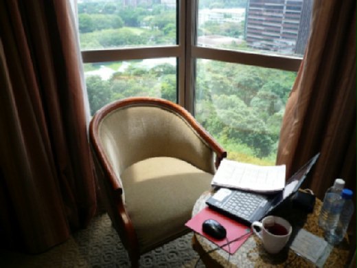 早上,切亮PRIVACY的燈,在房間中處理公事,