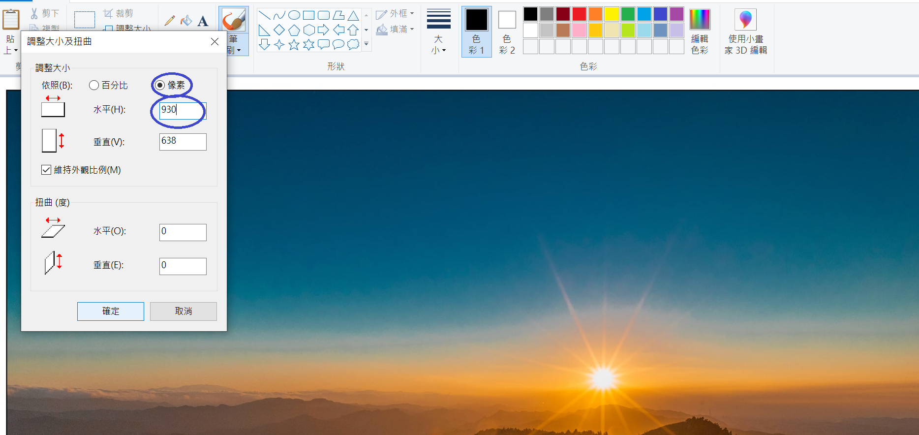 3.按調整大小,先按像素,水平調為930,垂直高度調為300,按確定,就成如下圖,大小稍有一點點差距,可以不用理它。按確定。