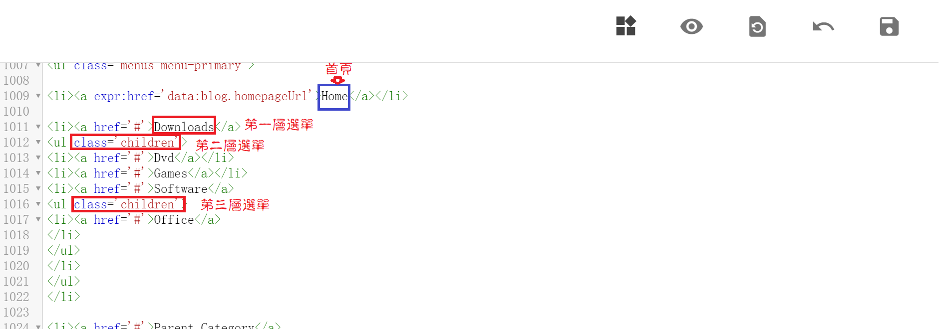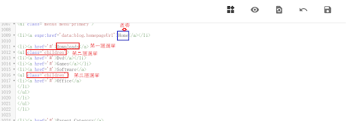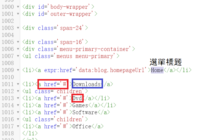 (18)進入HTML版面配置,編輯選單。寫上選單名稱及超連結。進入HTML修改或增減你需要的目錄項目,選單一定要在HTML裡面修正。