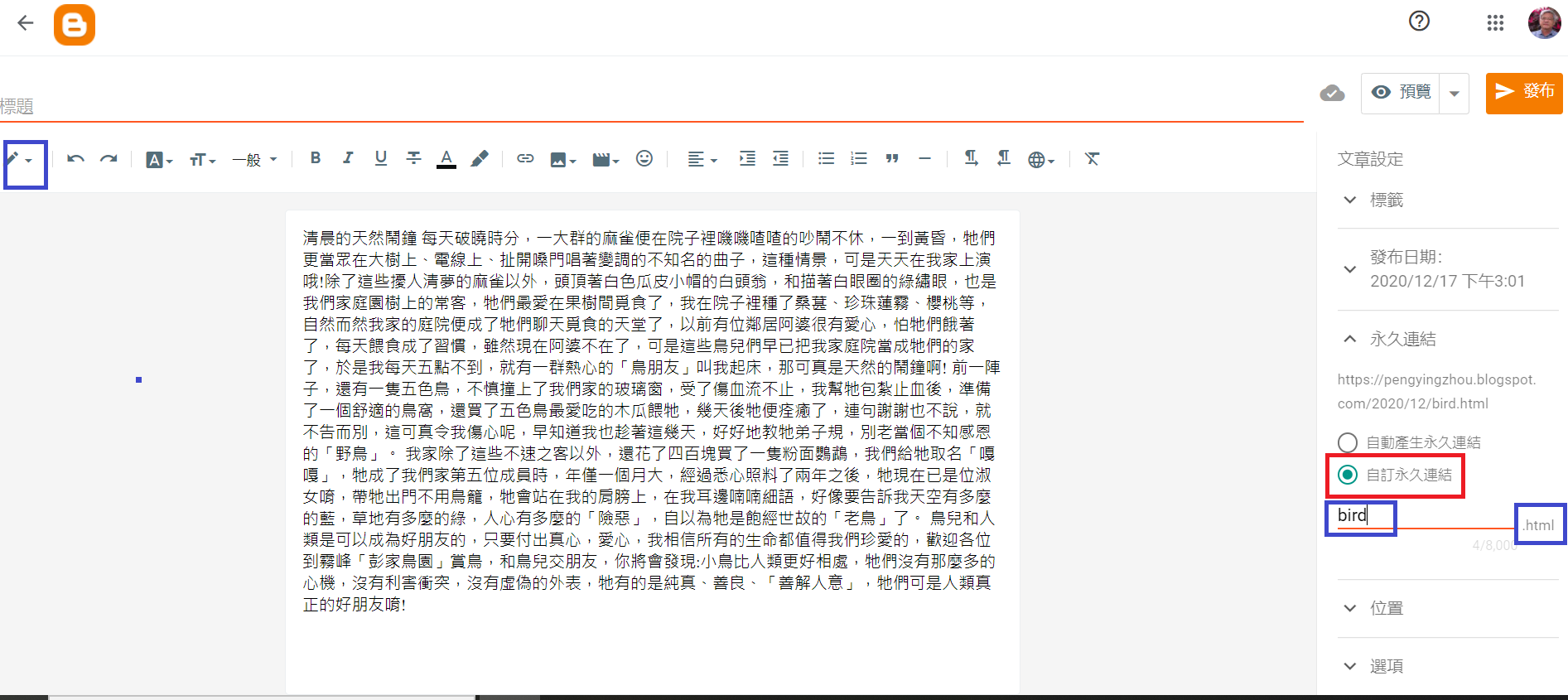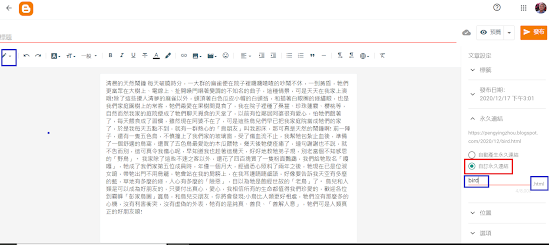 (15)測試文章編輯,自訂永久連結名稱(英文小寫),最後記得按下更新。