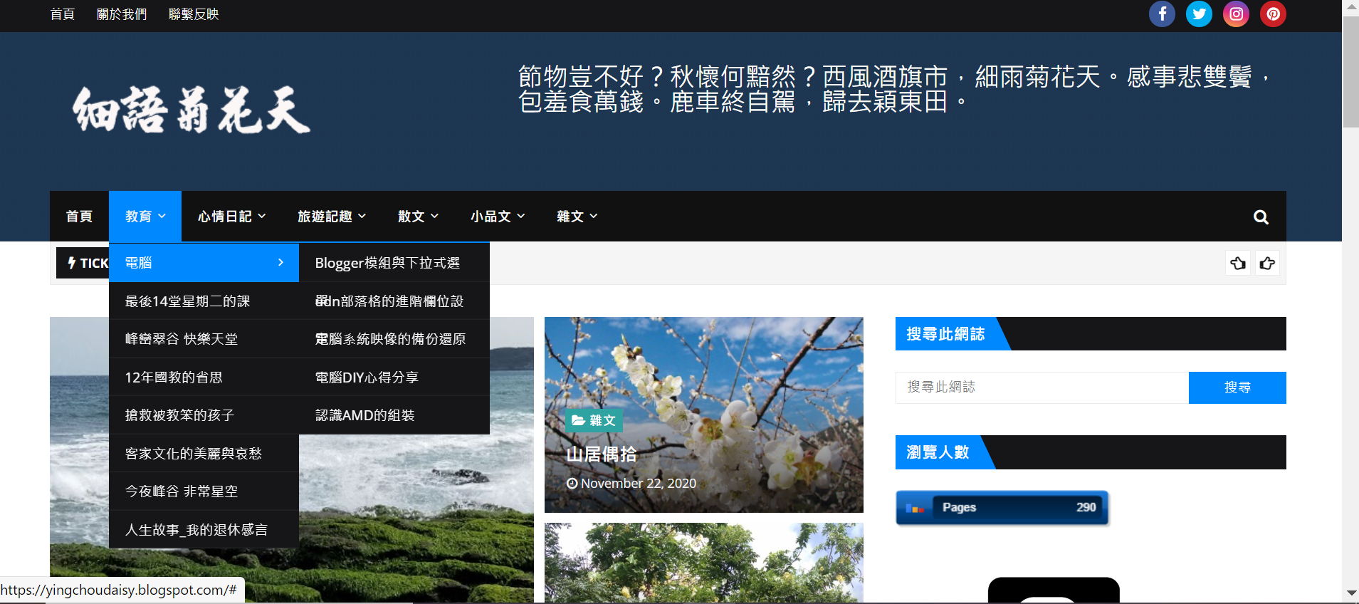 有一天在Facebook上看到有一個社群,叫做「年過50」,所附的條件是年齡超過50歲的大叔大媽們才有資格參加,我毫不考慮就提出申請,因為平日很少與人互動,找一群年紀相近(我比他們大很多)的朋友聊聊天,也好打發退休後無事可做的日子,可是看了許多組員的文筆都很好,觀念也不錯,激起了我也寫了幾篇小品,反應還算好,加上以前就常寫部落格,又看到「我愛寫部落格」的社團,於是也申請加入,還沒退休前,我在小學當網管兼寫學校網頁,我為什麼選擇Blogger?對網頁式的部落格也想嘗試看看,想配合一些HTML、JavaScript、CSS的語法,實驗看看效果如何,其實部落格跟網頁一樣,除了內容要好以外,外觀的形式功能也要能配合,就像鮮花也要綠葉來襯托它的美麗,這就是我的想法跟理念。