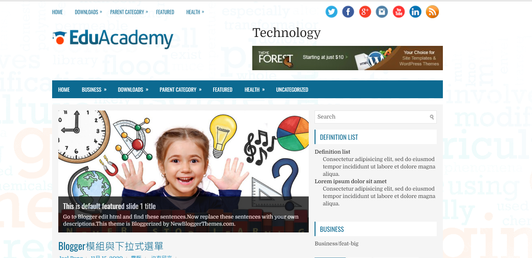 部落格分前台與後台,前台就是平常顯示給別人欣賞的畫面,後台是繕寫修改用的,一般Blogger提供的內建模板,是簡單模式,沒有下拉式或樹狀選單,樣式也大都沒有什麼特色,所以你想找一個適合你的風格的模組,就必須上網慢慢去試看DEMO,我都是先找10個左右,再試試看哪一個合用,下面(圖1)是我目前找到還算滿意的,各位如果中意,網站上就有下載點提供下載,並非上網找的都有下拉式的。