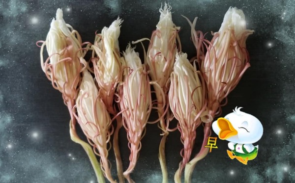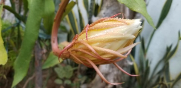曇花苞從長出那刻起,花苞後連在一起的一根空心圓筒形的莖,就一天天以肉眼可見的速度長大,慢慢地這根莖就變彎,變成一個状似釣魚的勾,掛住那個被粉紅花衣包裹的曇花蕾。