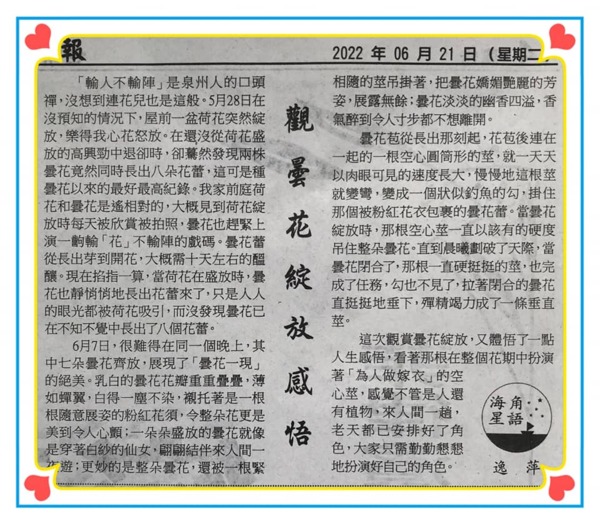 《觀曇花綻放感悟》刊于 06-21-2022菲律賓《世界日报》