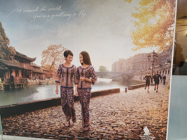 新加坡空乘這套齊腳踝的裙裝、與眾不同、南洋風情濃濃、精美蠟染布料以金彩絲線繡制花紋、端莊大方,依然如二十年前初見時靚麗——那年我曾在樟宜機場免稅店對著這套服裝,駐足良久,流連忘返。赴星島記(一)