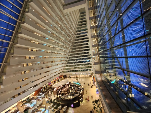 從濱海灣花園坐上接駁電車,穿越熱浪,幾分鐘就到金沙酒店(Marina Bay Sands)。從仿如熱爐的室外,來到冷氣十足的金沙酒店,確實令人舒暢多了但此時已是下午兩點,人人是餓到饑腸轆轆,急需先祭五臟。