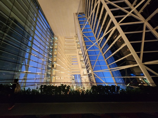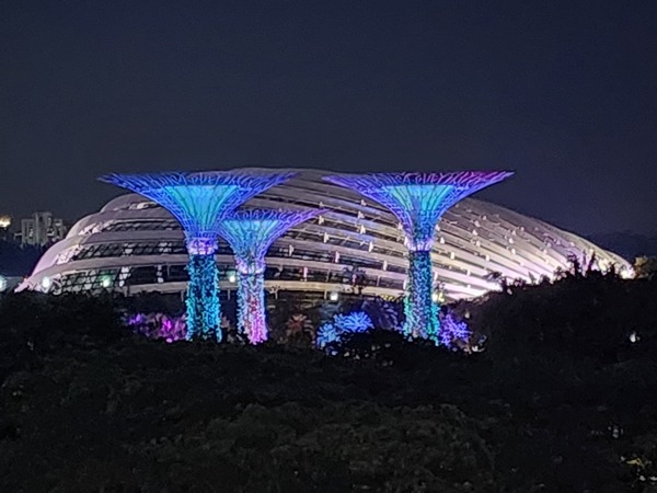 暮色降臨,酒店的人造奇觀達至高峰,晚上八點及九點,海灣上的音樂燈光水柱秀開始啟動;而酒店室外懸空花園走廊可直達太陽能巨樹處,夜晚的太陽能巨樹化作發光的珊瑚礁,在夜色中吞吐著幽藍的光芒。