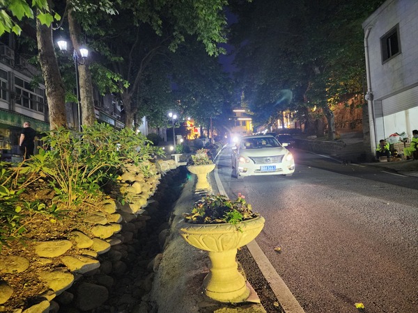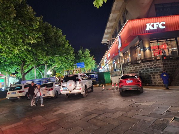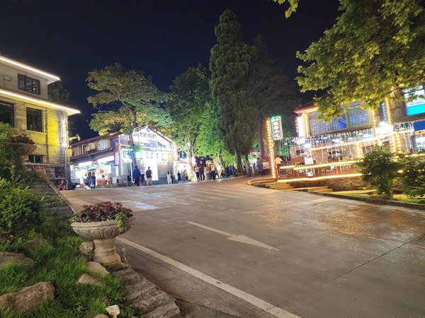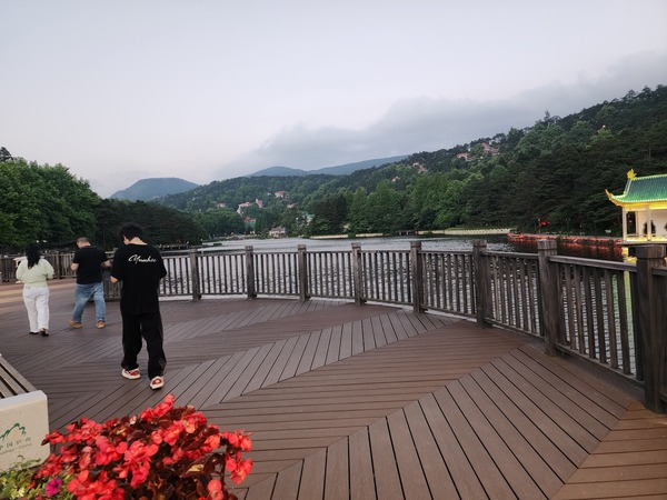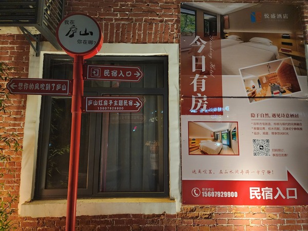 沿棧道行至湖盡頭,眼前驟然開朗:燈火輝煌,人聲鼎沸,遊人如織,熱鬧非凡。觀景臺、餐館、特色民宿林立,原來我們的酒店竟是處在「郊區」之地。再往前行,一個燈火通明、店鋪鱗次櫛比的街市躍然眼前,招牌上赫然寫著「牯嶺」。