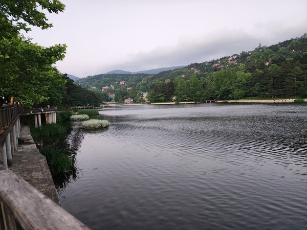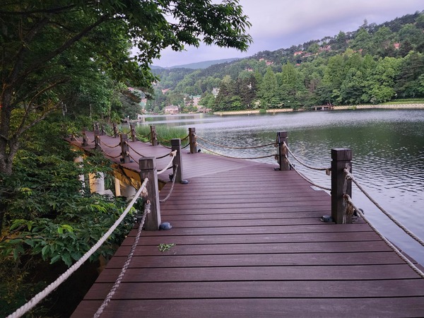 穿出山間小徑,來到對岸湖畔,有了遼闊的視野,比置身在山谷裏踏實多了。「如琴湖」因湖岸線曲折玲瓏,似一把靜臥的小提琴而得名。此時,天雖還處在黃昏中,可夜幕即將降臨,熾陽褪盡,清風徐來,神清氣爽,湖面波光粼粼。我一分鐘都不敢耽擱,心情輕鬆愉悅,如願地踏上左側的湖上棧道,開始我的「游」湖。