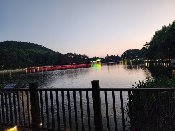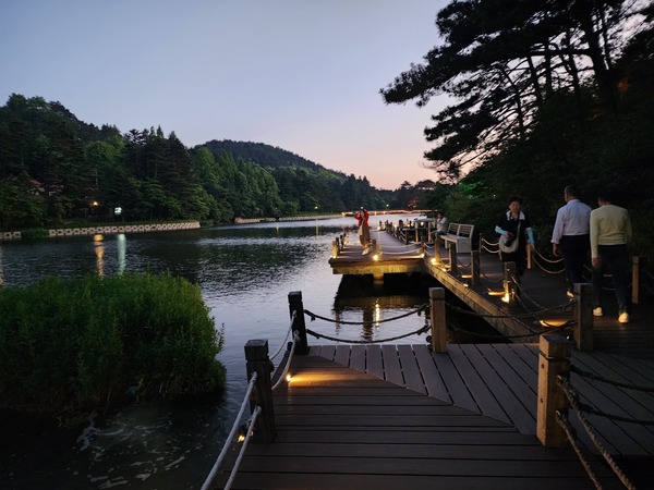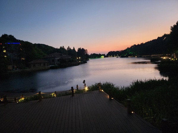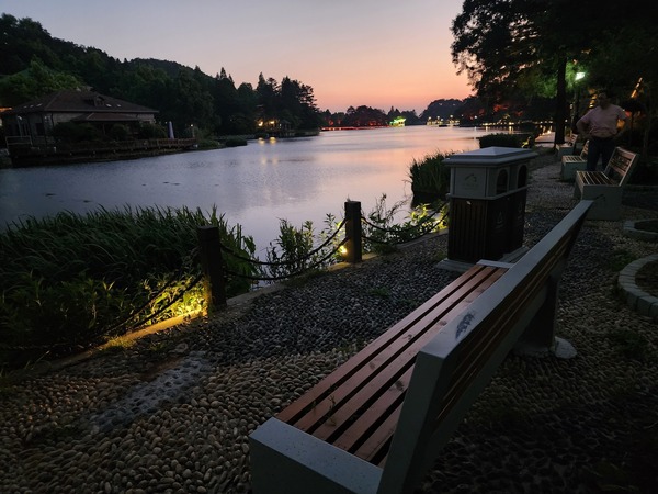 步移景換,說不出的暢快,一路遇到黃昏出來逛湖的游客。行至曲折棧橋,華燈初上,湖面倒映岸邊點點燈火,光影搖曳,恍若踏入仙境。一邊在湖上棧道漫步,一邊在心中再次竊喜:「今晚大膽獨行,何其正確!但依然暗暗為二十幾位團友惋惜,與美景擦肩而過!」
