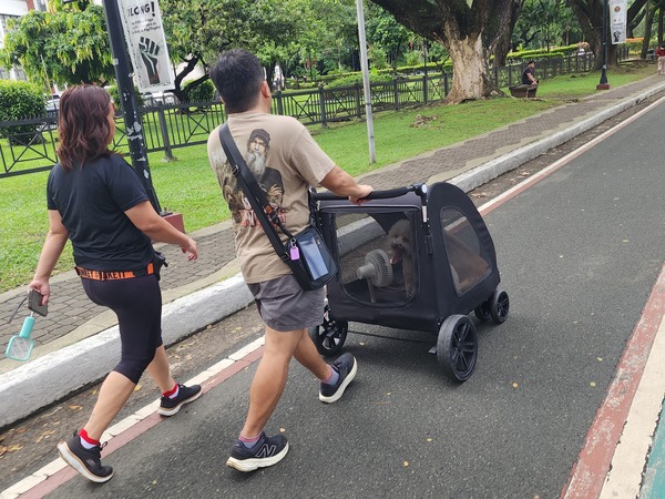 晨運道上的最奇葩當屬一對推著籠子車晨運的夫婦,細看才發現內裡是坐著兩條小狗,還有一把小電扇正為狗兒送涼風,這般待遇讓人忍俊不禁。