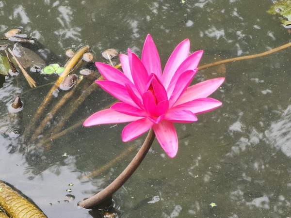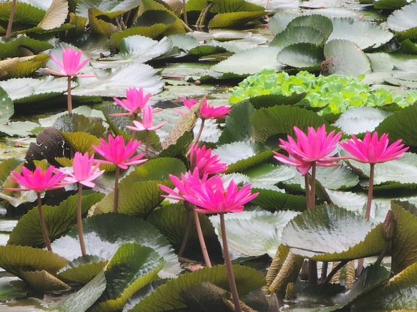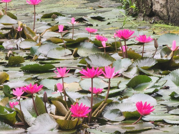 快步行走間忽被遠處池塘點點嫣紅吸引。走近才看清是一池紅睡蓮盛放,花瓣宛如一朵朵水中菊花。此時,正好三位年輕人在旁觀賞,其中女孩誤將池塘認作河流,同伴耐心解釋河流與池塘之別,令人不禁莞爾。