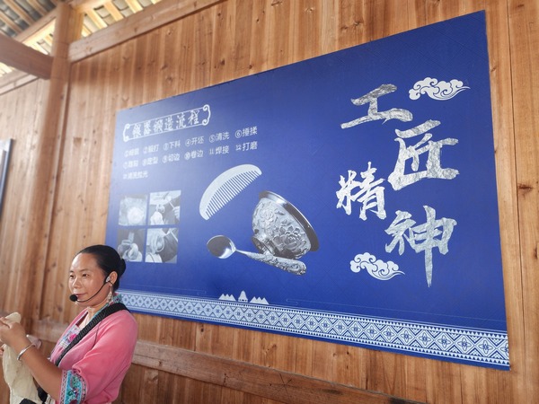 女解說員多次提到侗族如何使用銀器:用銀杯、銀碗喝水吃飯,銀器能吸附有害身體的毒素,避免攝入體內,當場做實驗給遊客看。