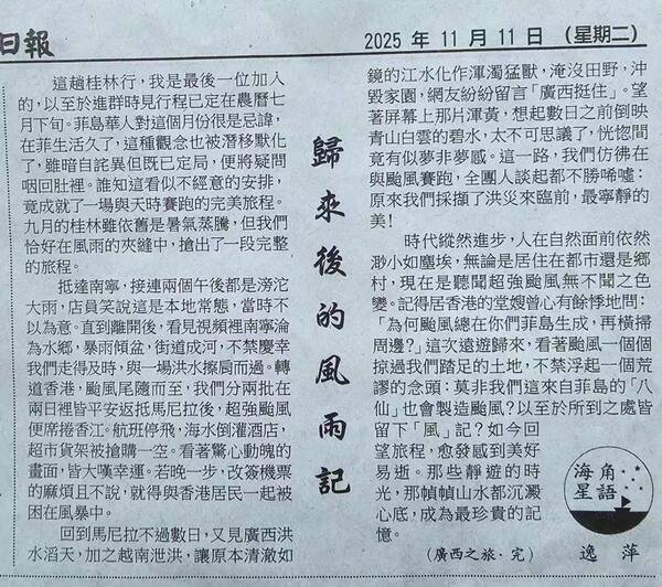 《歸來後的風雨記》刊于 11-06-2025菲律賓《世界日报》