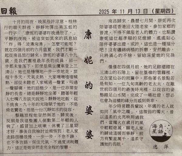十月的雨夜,晚風些許涼意。桂林行的聊天群裡,靜靜地彈出美玉姐的一行字:「康妮的婆婆昨晚過世了。」