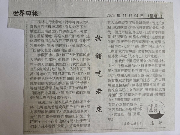 桂林之行出發前,對即將與我們相處數日的司機兼導遊,有點忐忑不安。畢竟上回南昌之行的導遊太令人失望,擔心重蹈覆轍,再迎來個“寶”,所幸,這位導遊有用心為我們打點行程,但也不忘賺外快,望著他的言行,腦海總閃出“扮豬吃老虎”這閩南俗語。