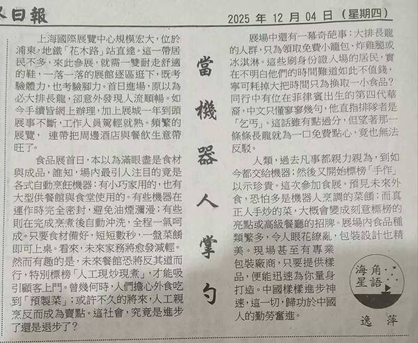 過去凡事都親力親為,到如今竟都交給了機器;然後又開始標榜「手作」以示珍貴。這次參加食展,預見未來外食,恐怕多是機器人烹調的菜餚;而真正人手炒的菜,大概會變成刻意標榜的亮點,或高級餐廳的招牌。